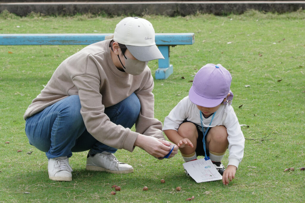 お母さんと一緒に、どんぐりひろい・・自分で作った袋に大切に入れてたね。