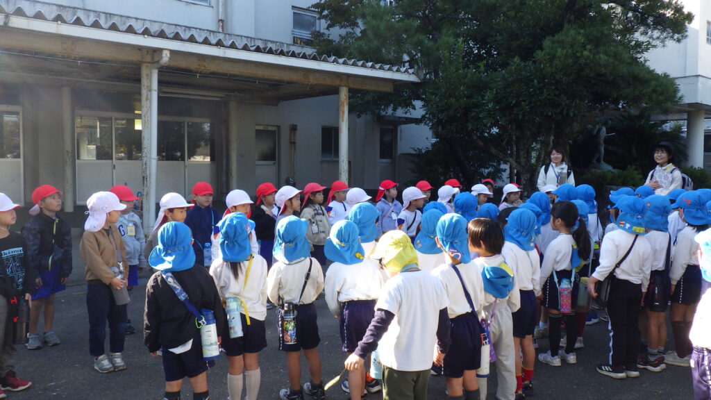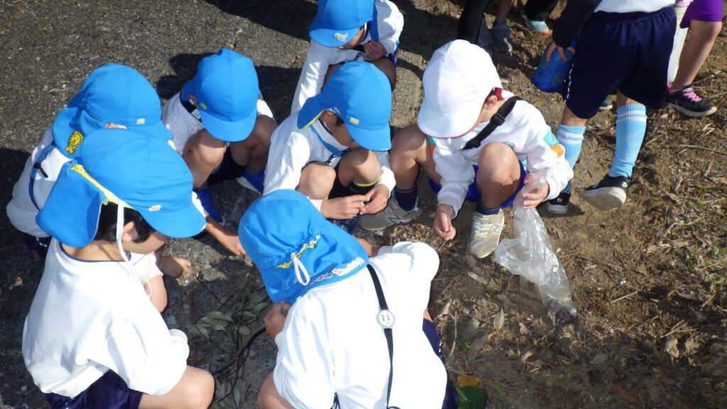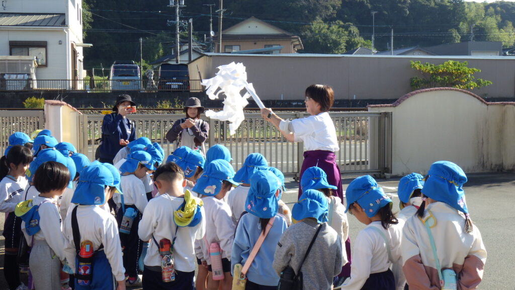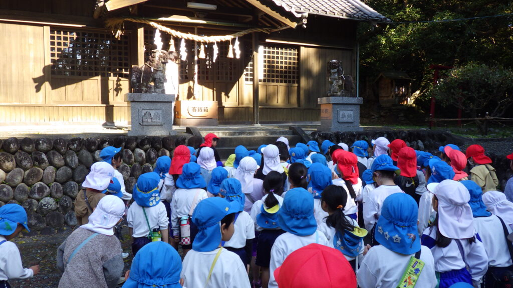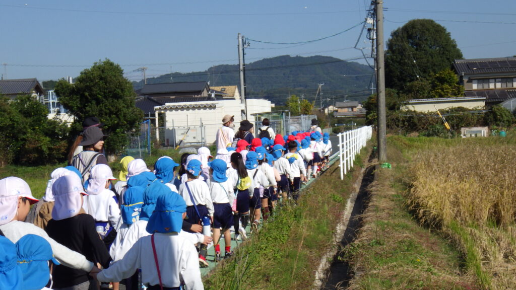 原谷小学校1年生と幼小接続交流で、八幡神社まで一緒に秋を見つけに出掛けてきました。久しぶりに会うお兄さんお姉さんと手を繋ぎ、色んな話をしながら道中楽しむことができました。