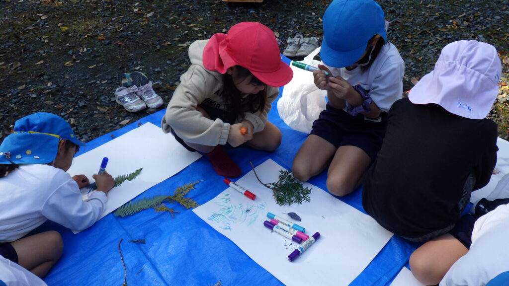 神社の広場で、集めた秋を画用紙に貼ったり、色付けしたり各々楽しみました。1年生のみんなありがとうございました。